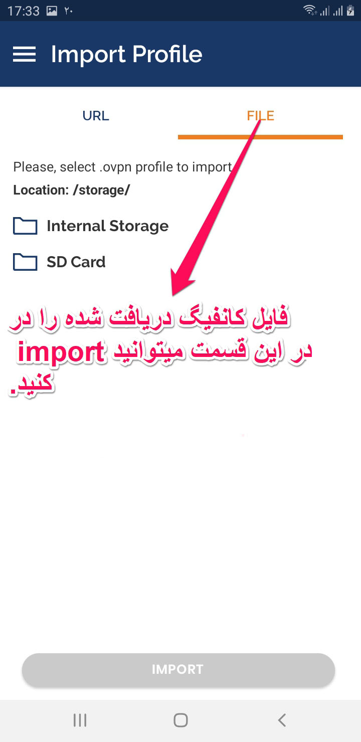 6- با وارد شدن به محل ذخیره دستگاه میتوانید فایل کانفیگ دریافت شده را در این قسمت میتوانید وارد کنید