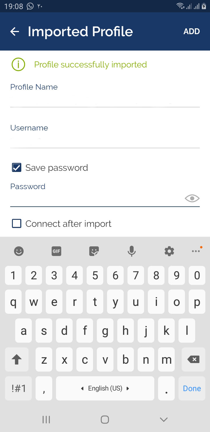 7- بعداز اینکه فایل کانفیگ را import کردیم ، نام کاربری و پسورد خود را جهت اتصال وارد و دکمه کانکت را میزنیم.